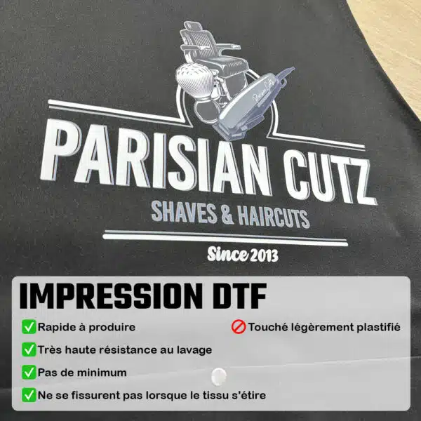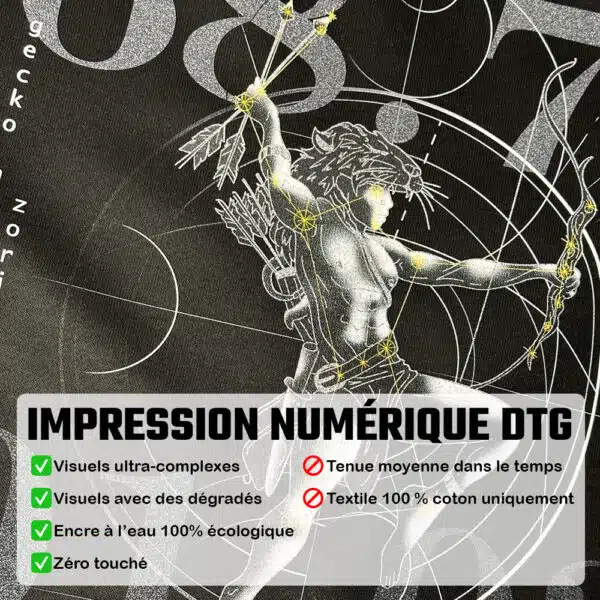 - ✔ Impression DTF : Technique moderne et flexible, idéale pour des impressions détaillées sur divers textiles.