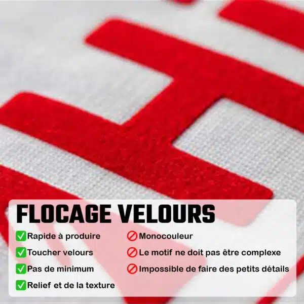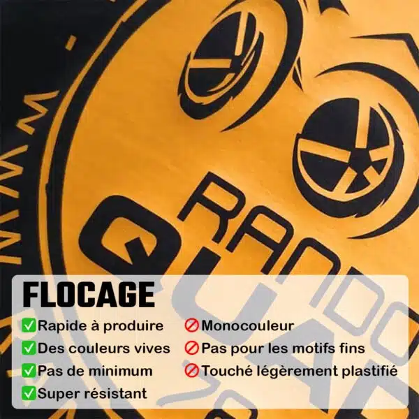 - ✔ Flocage : Une technique rapide et polyvalente pour des impressions nettes.